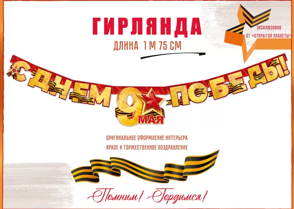 День Победы — это особенный праздник! Сколько бы лет ни прошло, мы по-прежнему гордимся подвигом наших Героев! Яркая красочная гирлянда от ТМ «Открытая планета» станет отличным украшением праздничного мероприятия в честь 9 Мая. Она подойдет для школы, детского сада, дома и разных учреждений.