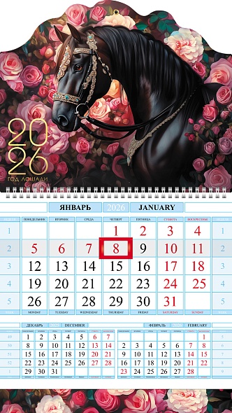 Календарь квартальный 1-блоч. на 1 гребне 2026г Соло-Люкс с вырубкой Год Лошади