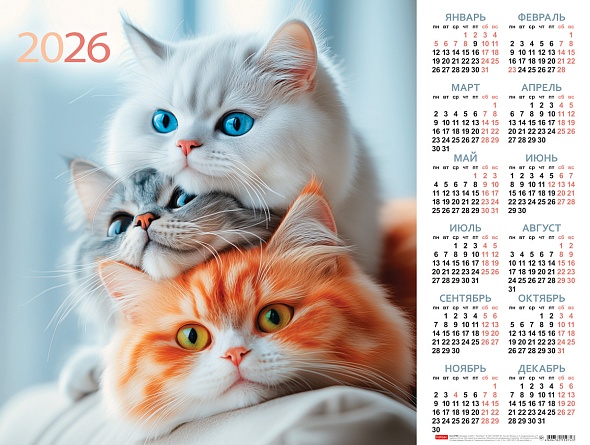 Календарь листовой А2 Hatber 2026г Белый, Серый, Рыжий
