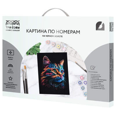 1) черный холст на деревянном подрамнике 30*40 с нанесенным контуром, пронумерованный в соответствии с номерами красок. Контур под раскрашивание нанесен не на всю поверхность холста. Технология точной разбивки сюжета картины на разные цветовые оттенки гарантируют правильность исполнения полотна;