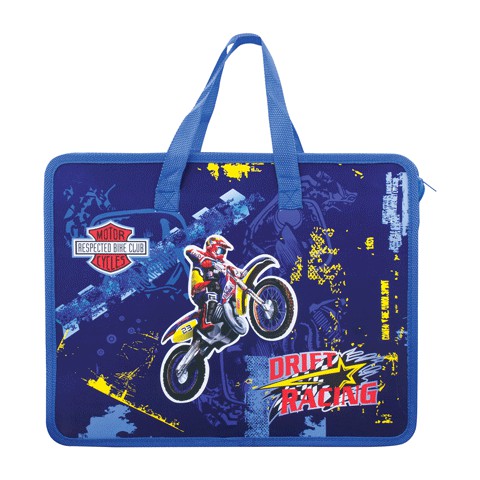 Папка-сумка BRAUBERG (БРАУБЕРГ), А4, на молнии, с ручкой, “Drift racing” (“Мотогонка”), цветная печать, для мальчиков, 33х26 см.. 1 отделение. Изготовлена из пластика.Застежка на молнии.