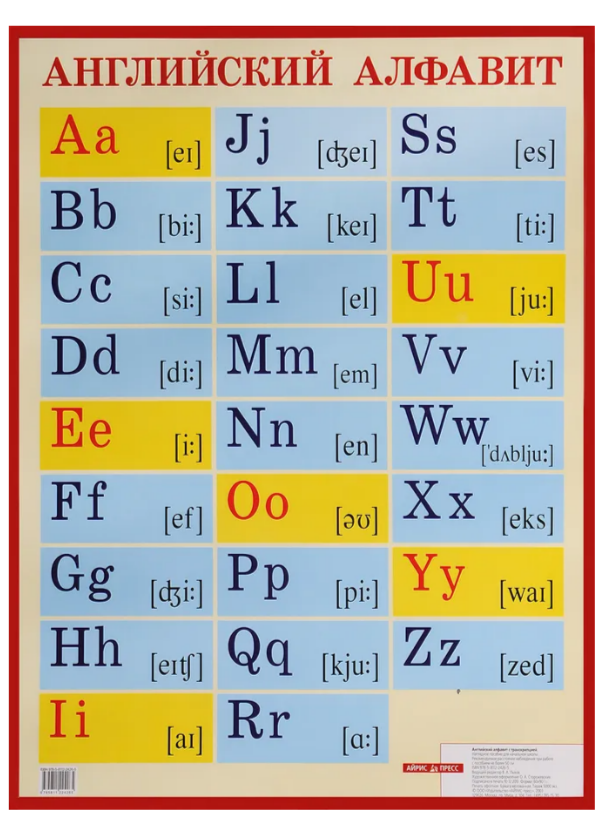 На красочно оформленном плакате помещен английский алфавит с транскрипцией. Пособие предназначено для работы с детьми младшего школьного возраста.
