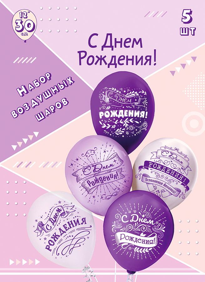 Шары воздушные 12", КОМПЛЕКТ 5шт. СДР! Сиреневый микс