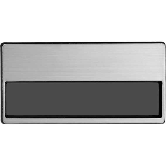 Бейдж “deVENTE” 68×33 мм, горизонтальный, из твердого пластика, с фронтальной металлической пластиной и прозрачным окном 61×13 мм, на магните, серебристый